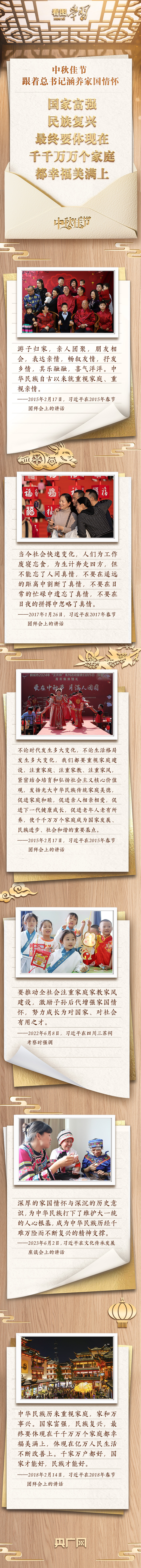 每逢佳節(jié)倍思親。中華民族自古以來便有重視家庭、家國(guó)一體的情懷。黨的十八大以來,習(xí)近平總書記提出以人民為中心的發(fā)展思想,把人民對(duì)美好生活的向往作為奮斗目標(biāo),注重加強(qiáng)家庭家教家風(fēng)建設(shè),以小家庭的和睦美滿促進(jìn)國(guó)家社會(huì)和諧穩(wěn)定。