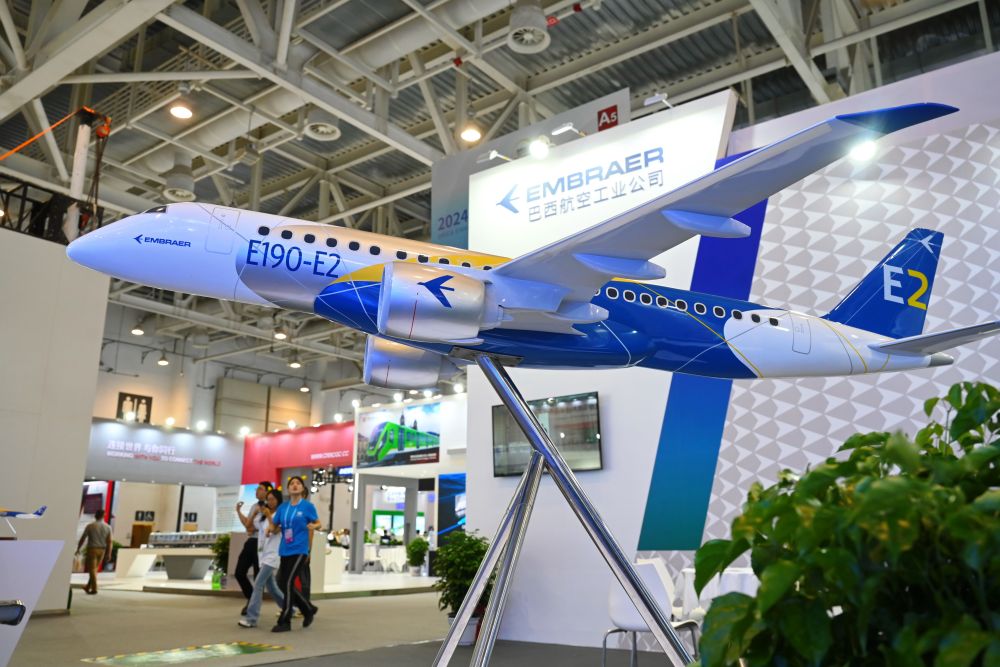 這是在廈門舉行的2024金磚國家新工業(yè)革命展巴西展位展出的E190-E2飛機模型。新華社記者林善傳攝