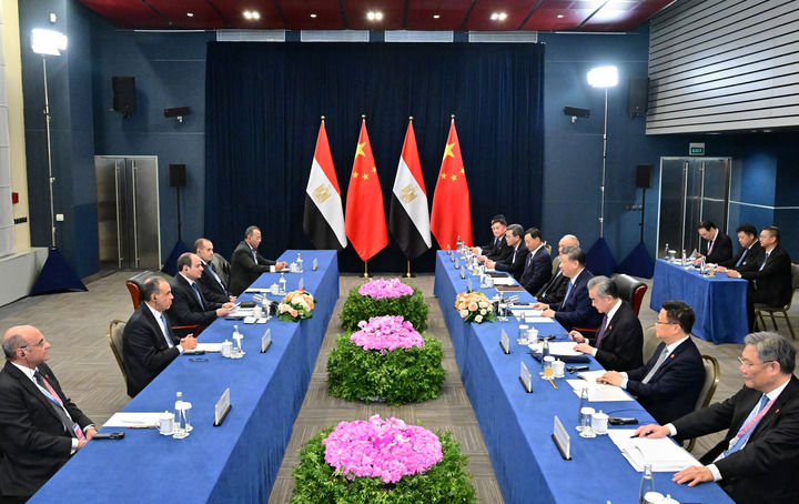 習(xí)近平祝賀并歡迎埃及首次作為正式成員參加金磚國家領(lǐng)導(dǎo)人會晤。習(xí)近平指出,今年是“中?;锇槟辍焙蛢蓢⑷鎽?zhàn)略伙伴關(guān)系10周年。中方堅(jiān)定支持埃及維護(hù)國家主權(quán)、安全、發(fā)展利益,愿同埃方做守望相助的真誠朋友、攜手發(fā)展的親密伙伴。雙方要繼續(xù)堅(jiān)定相互支持,鞏固政治互信,深化務(wù)實(shí)合作,高質(zhì)量共建“一帶一路”,密切人文交流,推動雙邊關(guān)系朝著構(gòu)建面向新時代的中埃命運(yùn)共同體目標(biāo)持續(xù)邁進(jìn)。中方也愿同埃方加強(qiáng)協(xié)調(diào),推動“大金磚合作”行穩(wěn)致遠(yuǎn),進(jìn)一步提升全球南方影響力和發(fā)言權(quán),維護(hù)發(fā)展中國家共同利益。