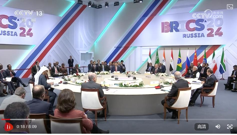 當(dāng)?shù)貢r間10月23日上午,金磚國家領(lǐng)導(dǎo)人第十六次會晤在喀山會展中心舉行。俄羅斯總統(tǒng)普京主持會晤。中國國家主席習(xí)近平、巴西總統(tǒng)盧拉(線上)、埃及總統(tǒng)塞西、埃塞俄比亞總理阿比、印度總理莫迪、伊朗總統(tǒng)佩澤希齊揚(yáng)、南非總統(tǒng)拉馬福薩、阿聯(lián)酋總統(tǒng)穆罕默德等出席。