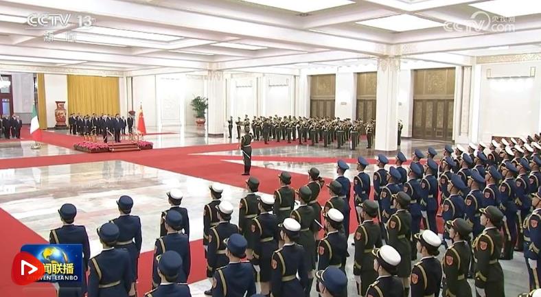 天安門廣場(chǎng)鳴放21響禮炮,禮兵列隊(duì)致敬。兩國(guó)元首登上檢閱臺(tái),軍樂團(tuán)奏中意兩國(guó)國(guó)歌。馬塔雷拉在習(xí)近平陪同下檢閱中國(guó)人民解放軍儀仗隊(duì),并觀看分列式。