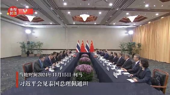 當地時間11月15日,國家主席習近平在利馬出席亞太經合組織領導人非正式會議期間會見泰國總理佩通坦。