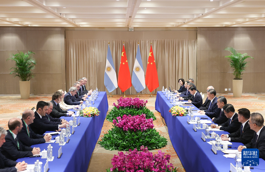 當?shù)貢r間11月19日上午,國家主席習近平在里約熱內(nèi)盧出席二十國集團領導人峰會期間會見阿根廷總統(tǒng)米萊。新華社記者 張領 攝
