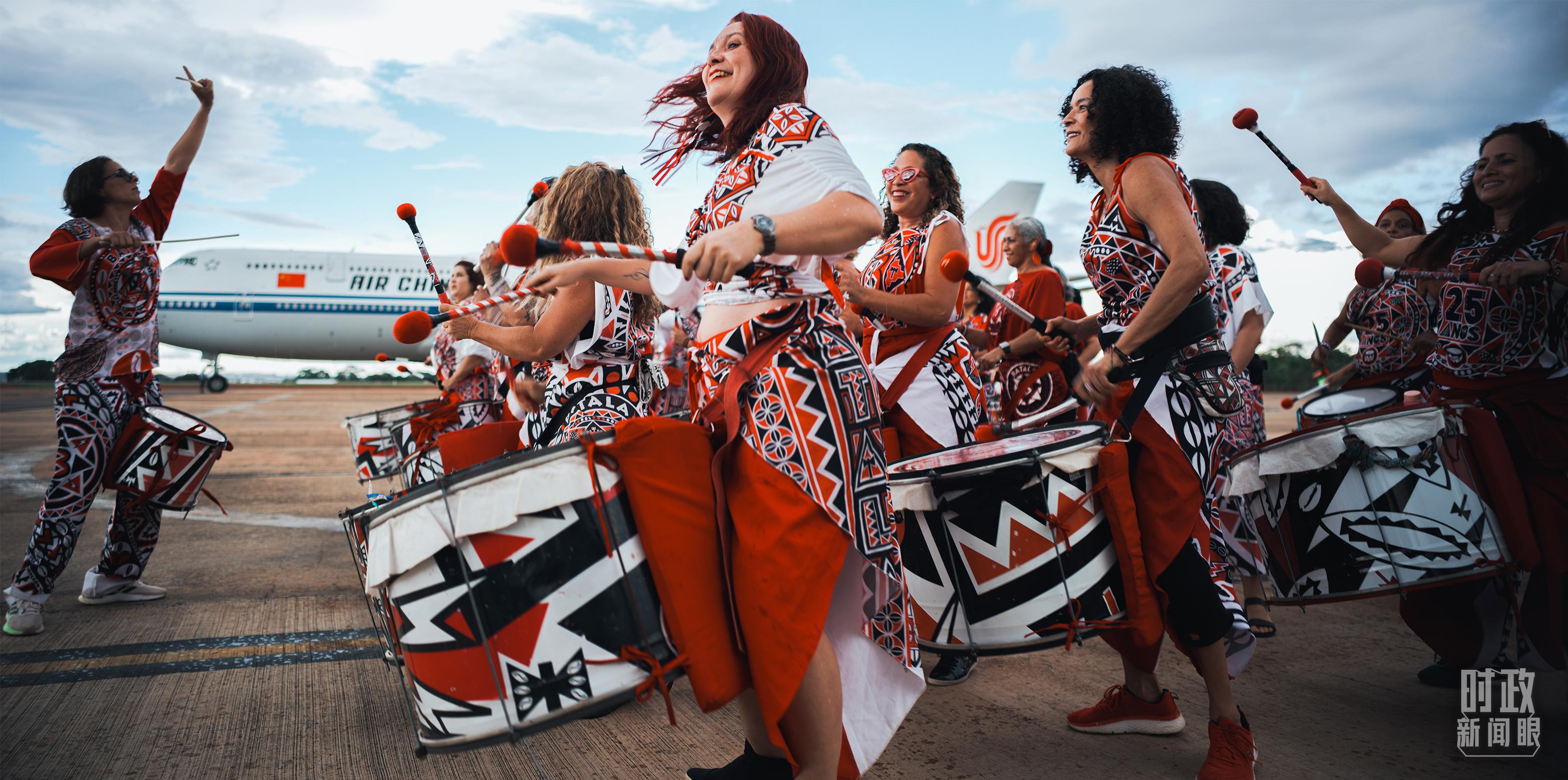 習主席乘專機抵達巴西利亞,藝術(shù)家演奏特色鼓樂。(總臺央視記者彭漢明拍攝)