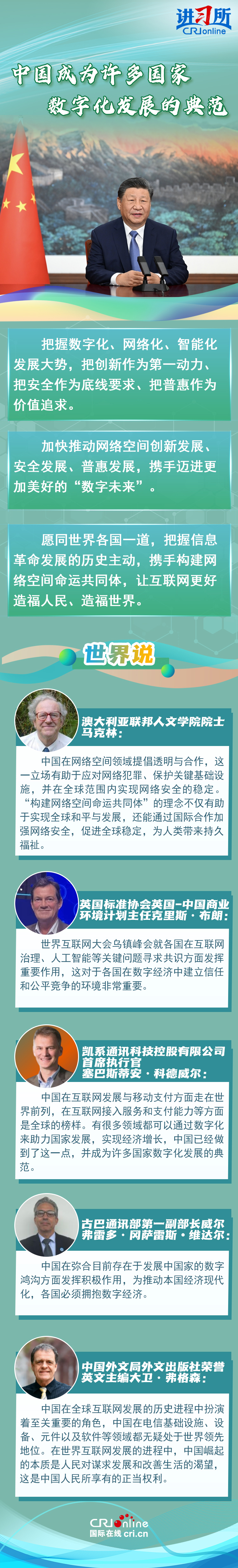 今年是習(xí)近平主席提出建設(shè)網(wǎng)絡(luò)強國戰(zhàn)略10周年,也是中國全功能接入國際互聯(lián)網(wǎng)的30周年?;厥住熬W(wǎng)”事,在習(xí)近平主席的引領(lǐng)下,中國不斷加強數(shù)字經(jīng)濟、人工智能領(lǐng)域發(fā)展,深化網(wǎng)絡(luò)空間國際交流合作,構(gòu)建網(wǎng)絡(luò)空間命運共同體理念主張不斷深入人心。
