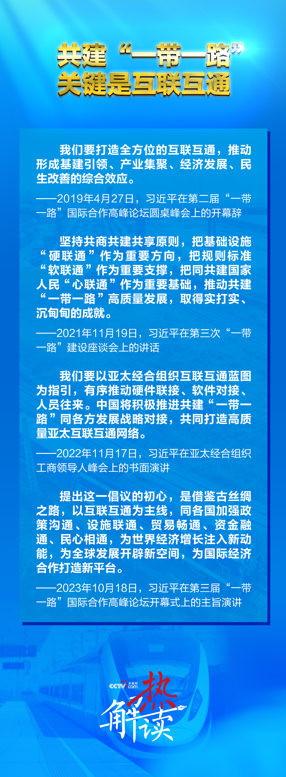 十年前,在加強(qiáng)互聯(lián)互通伙伴關(guān)系對話會上,習(xí)主席用一則“妙喻”闡釋互聯(lián)互通之于“一帶一路”的重要性——如果將“一帶一路”比喻為亞洲騰飛的兩只翅膀,那么互聯(lián)互通就是兩只翅膀的血脈經(jīng)絡(luò)。此后,在不同外事場合,習(xí)主席多次提出要深化“一帶一路”互聯(lián)互通、實(shí)現(xiàn)更高層次的互聯(lián)互通。