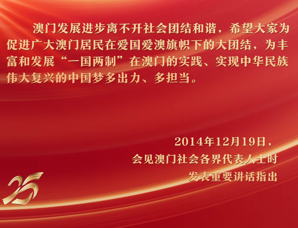 25年來,澳門社會各界在愛國愛澳的旗幟下實現(xiàn)廣泛團結(jié),愛國愛澳力量在社會政治生活中始終占據(jù)主導(dǎo),為特區(qū)政府依法有效施政、確保“一國兩制”在澳門成功實踐奠定了堅實的基礎(chǔ)。