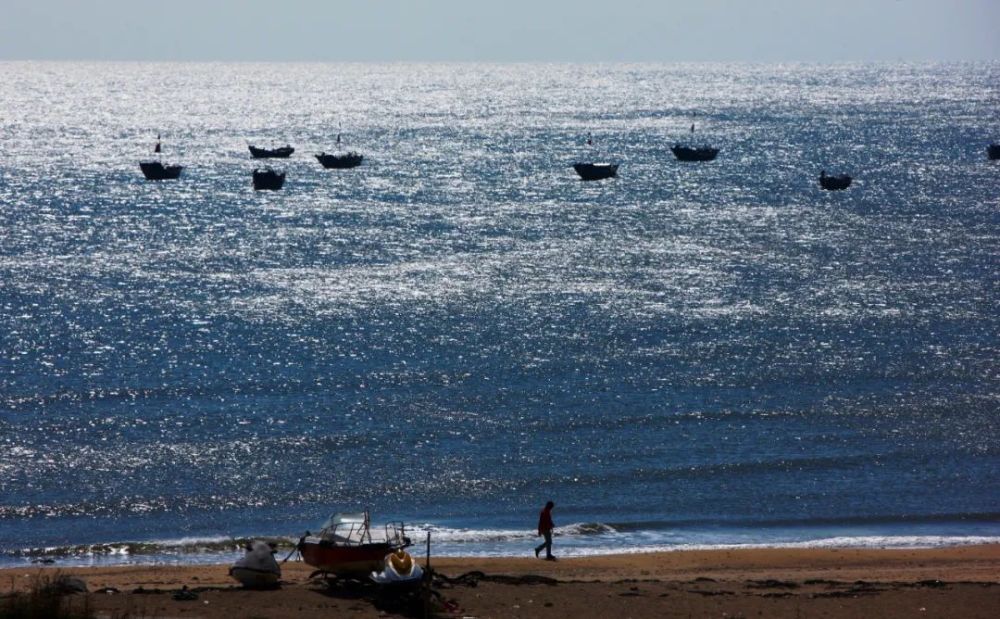 一名男子走在覺華島的沙灘上。新華社記者 郭求達 攝