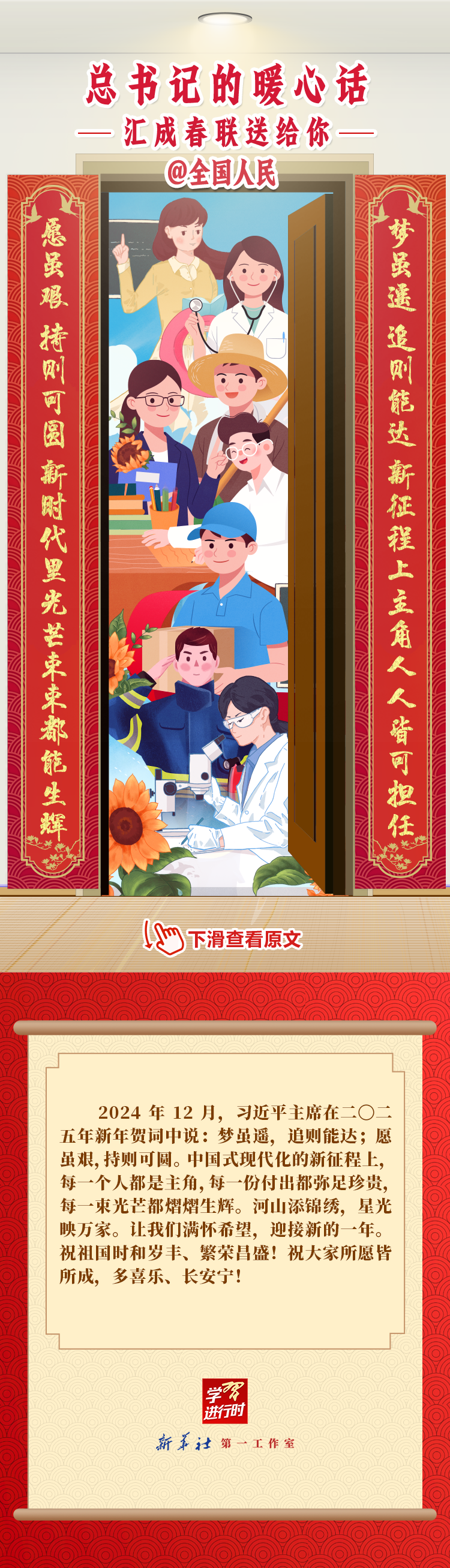 【學(xué)習(xí)進行時】過春節(jié),貼春聯(lián),寄托人們對新年的美好愿望。過去一年,習(xí)近平總書記在不同場合點贊各行各業(yè)奮斗者,說了許多暖心話。新春之際,我們匯編成聯(lián),向新征程上的每一位“主角”致敬,送上新春的祝福。