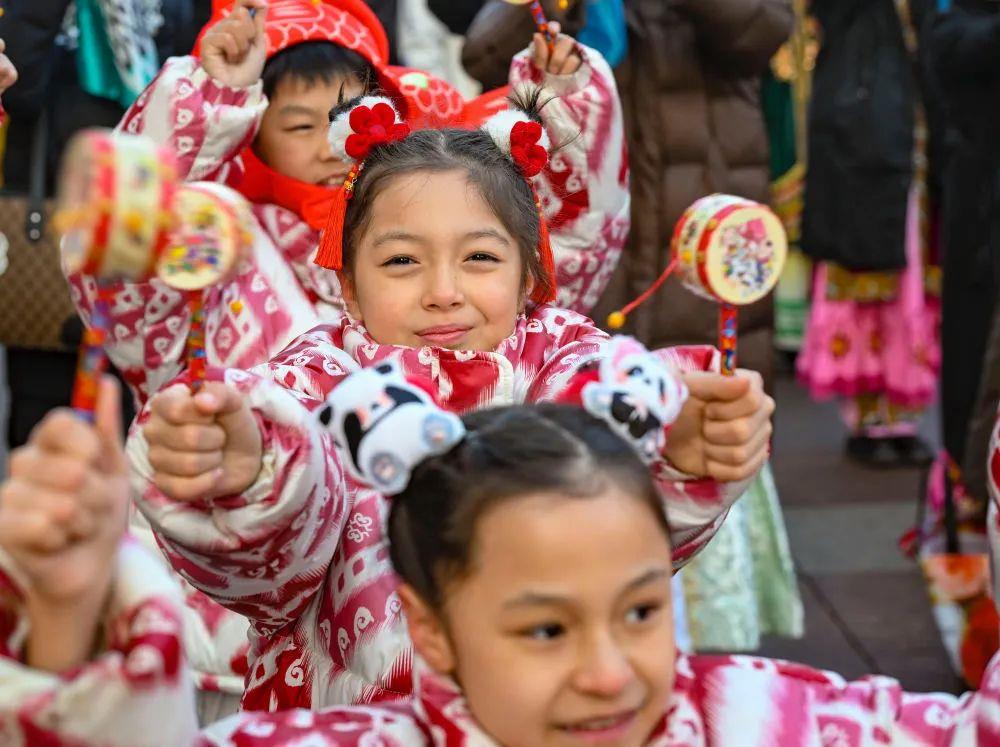 新疆大巴扎社火迎新春,孩子們?cè)诂F(xiàn)場表演。