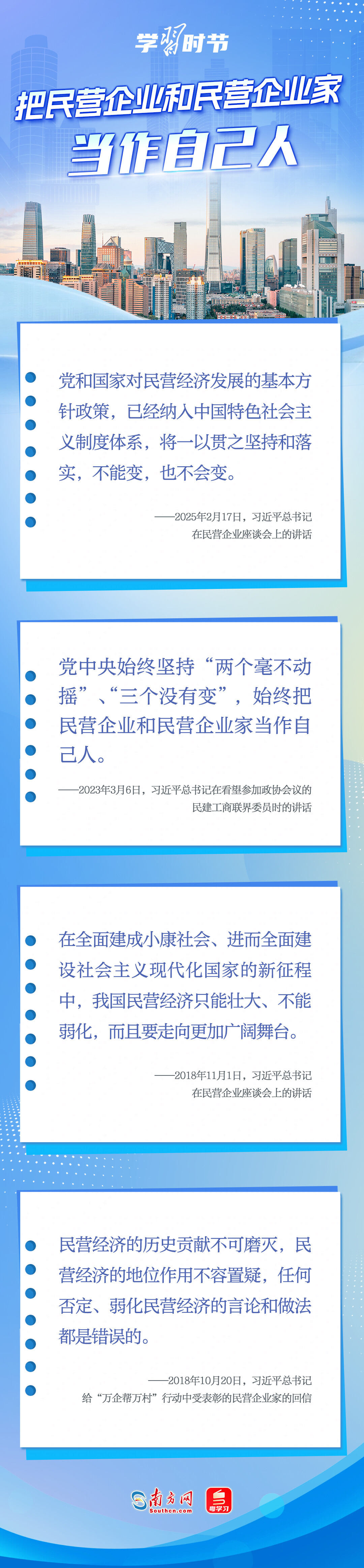 黨的十八大以來,習近平總書記對民營經(jīng)濟發(fā)展高度重視、念茲在茲,多次重申堅持“兩個毫不動搖”的重要方針,強調(diào)鼓勵、支持、引導(dǎo)非公有制經(jīng)濟繼續(xù)發(fā)展壯大,為實現(xiàn)民營經(jīng)濟健康發(fā)展、高質(zhì)量發(fā)展注入強大信心和動力。讓我們一起學(xué)習習近平總書記關(guān)于民營經(jīng)濟的重要論述,在關(guān)鍵時刻讓民營企業(yè)和民營企業(yè)家堅定發(fā)展信心,踏踏實實謀發(fā)展。
