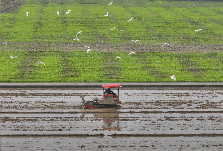 2025年2月25日,在浙江省瑞安市馬嶼鎮(zhèn)儒陽(yáng)村,農(nóng)機(jī)在田間犁地,白鷺低空而飛(無(wú)人機(jī)照片)。