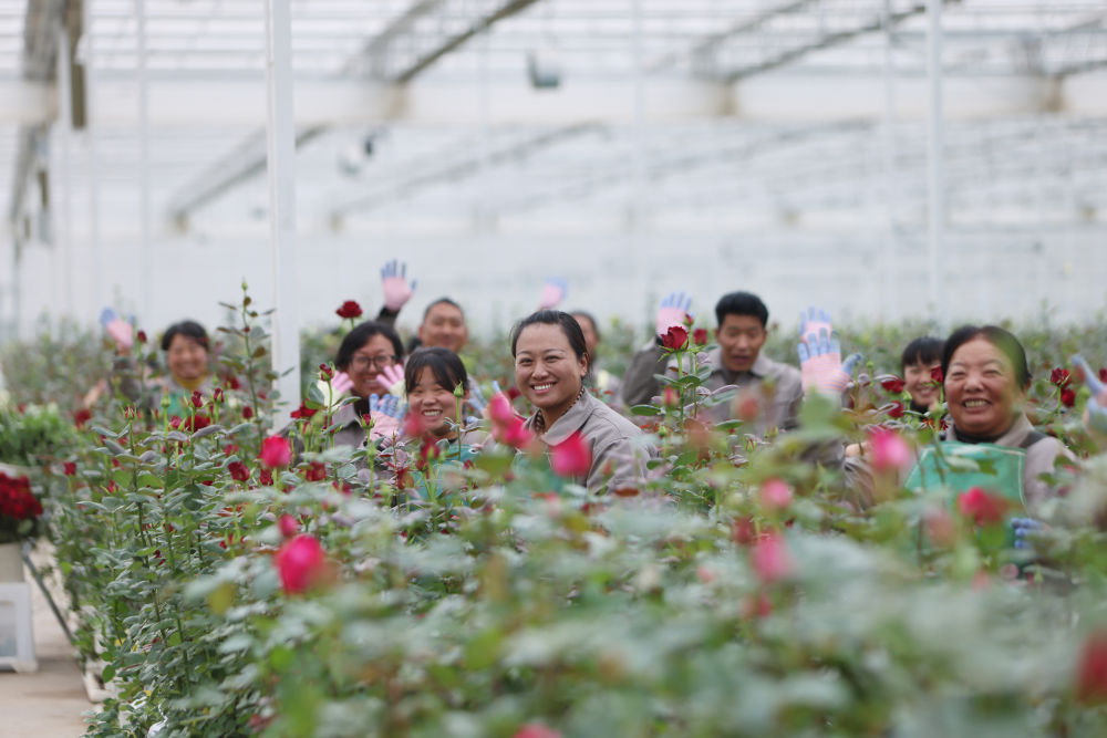2019年2月15日,在云南省石林彝族自治縣錦苑花卉產(chǎn)業(yè)園,花農(nóng)采摘和搬運鮮花。