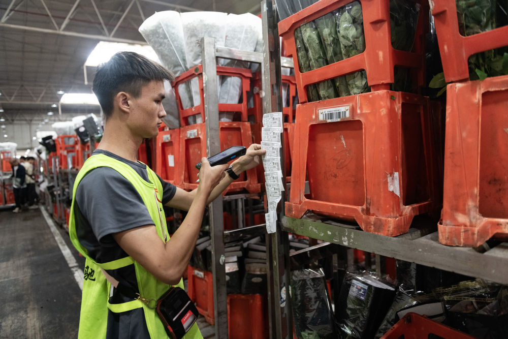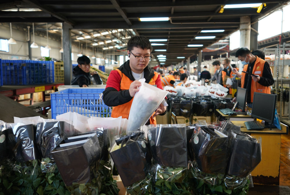 2022年11月11日,工作人員在昆明斗南花市給鮮花貼標簽??爝f物流時效不斷優(yōu)化、冷鏈運輸技術(shù)持續(xù)提升,也為中國鮮花加速“出?!北q{護航。