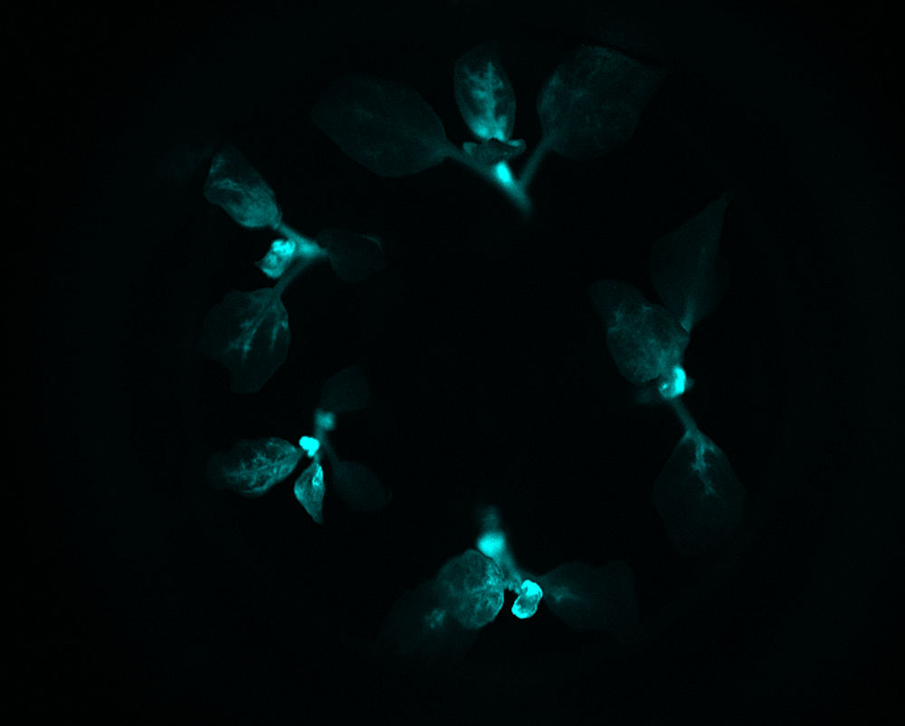 這是云南某農(nóng)業(yè)研發(fā)團隊利用基因技術(shù)成功培育出肉眼可見的“自發(fā)光植物”在黑暗條件下發(fā)光(2017年6月21日攝)。