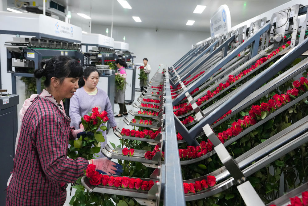 2024年8月23日,在云南晉寧花卉產(chǎn)業(yè)現(xiàn)代化示范園采后處理中心,花農(nóng)將鮮切花自動分揀流水線上分揀好的鮮花取下,準備放入包裝流水線。