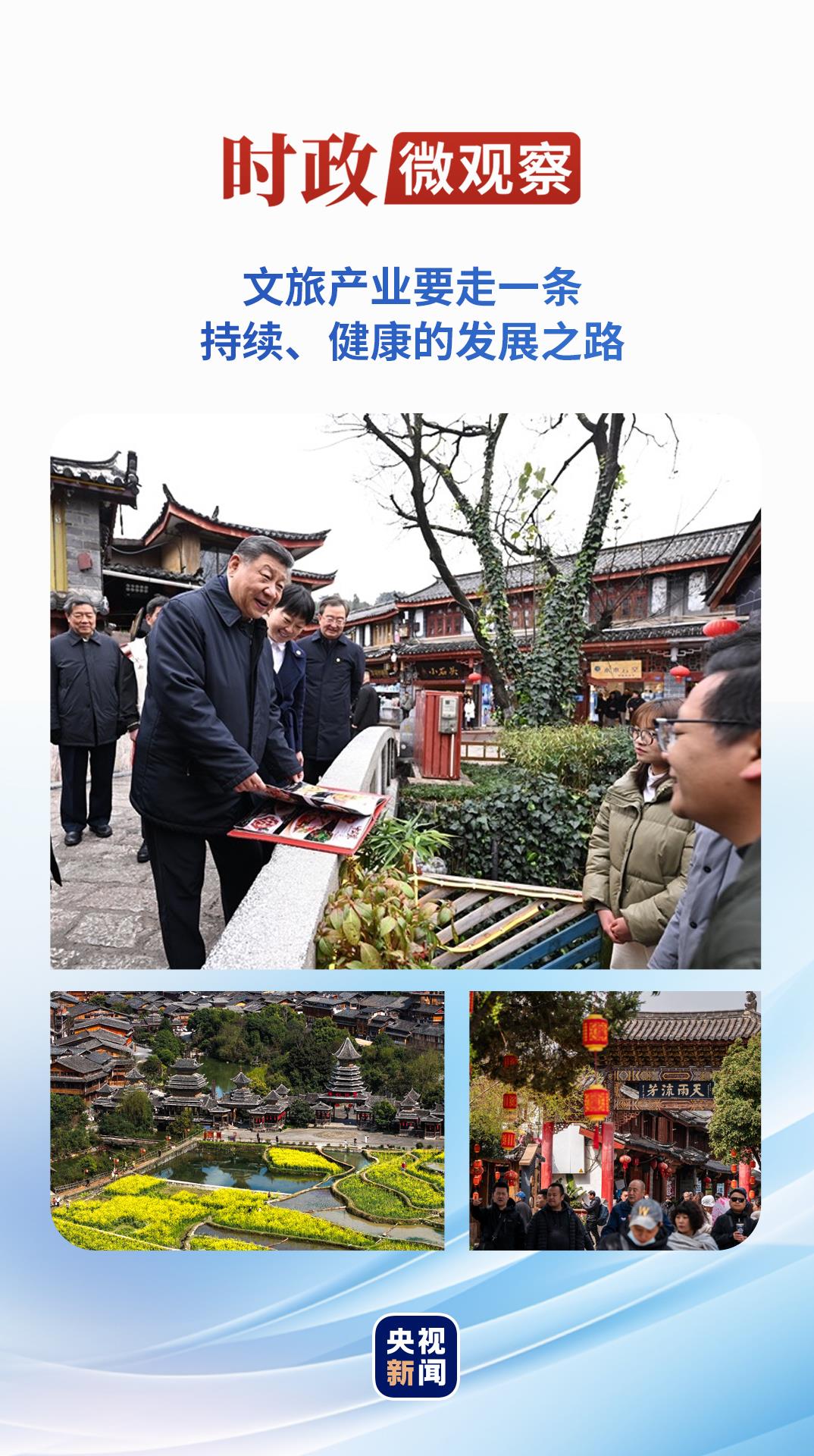 在云南麗江古城,總書記沿著石板路邊走邊看,與居民和游客親切交流:“麗江有美麗風光,有特色文化,有很高知名度,一定能走出一條持續(xù)健康的文旅發(fā)展之路?!彼螽?shù)靥幚砗帽Wo和發(fā)展的關系,讓這座美麗的古城煥發(fā)新的光彩。