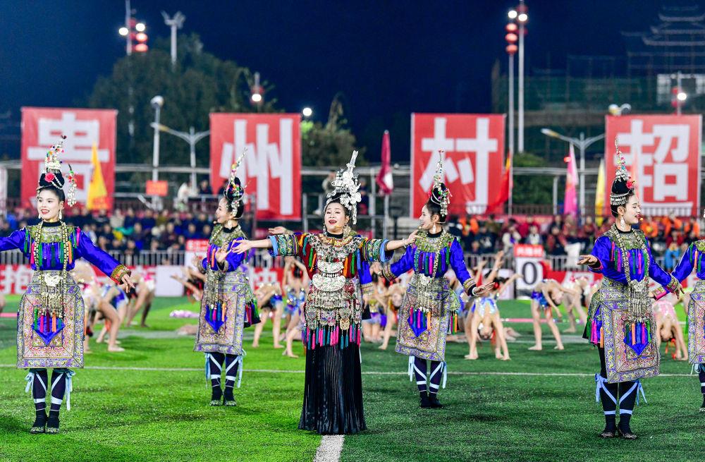 2025年3月14日,2025年貴州“村超”40強交叉賽在榕江“村超”足球場舉行,演員在比賽間隙表演侗族大歌。