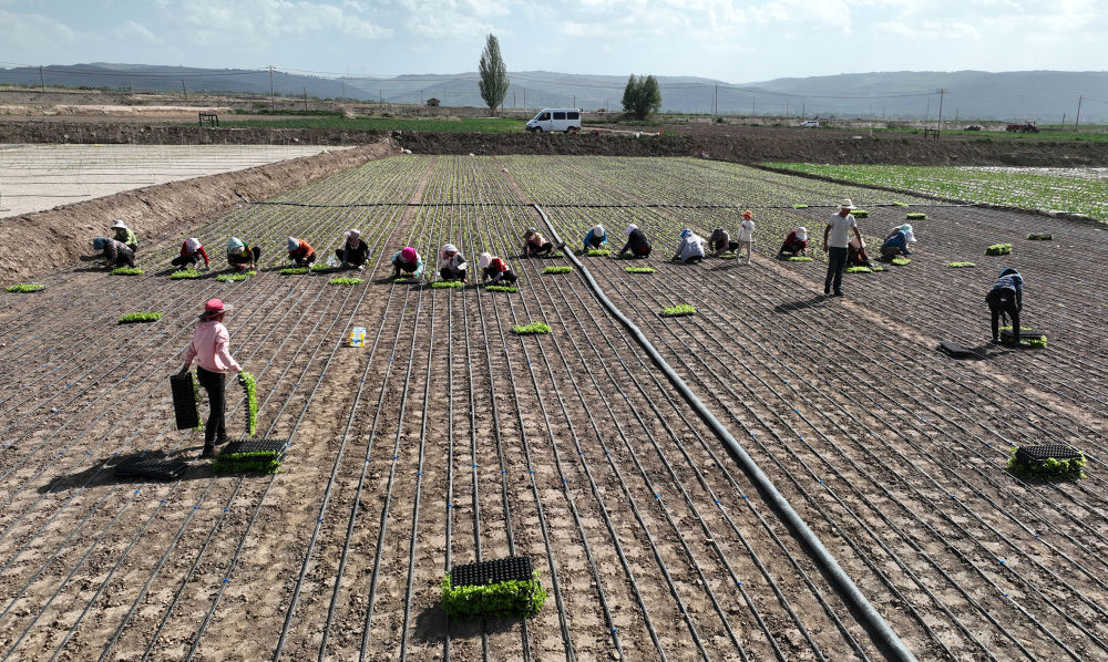 甘肅省定西市安定區(qū)內(nèi)官營(yíng)鎮(zhèn)菜農(nóng)在鋪設(shè)了滴灌管道的地里移植西芹(資料圖片)。(楊曉軍 攝)
