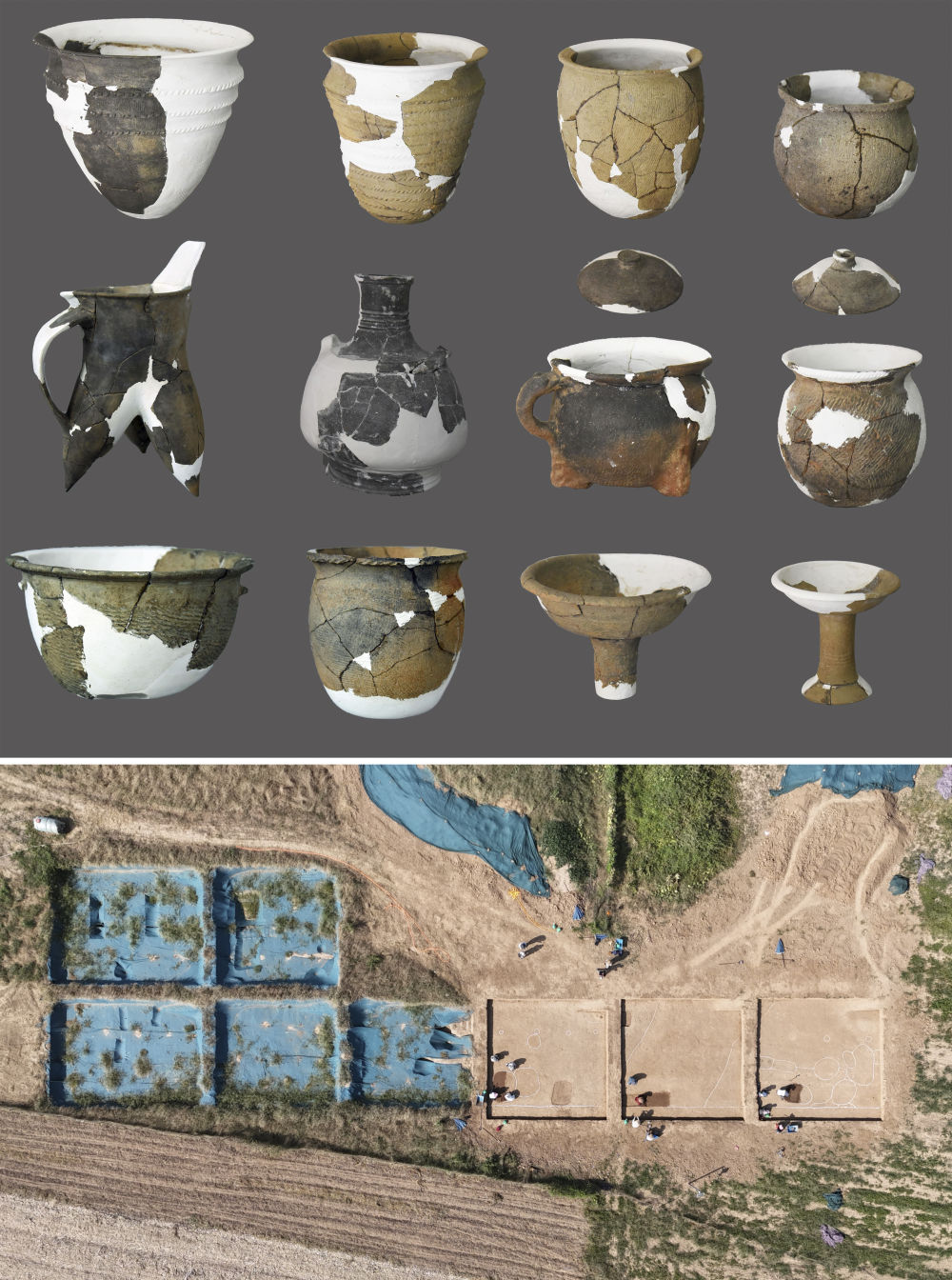 拼版照片:上圖為位于河南南陽方城縣的八里橋遺址出土的陶器(河南省文物考古研究院供圖);下圖為八里橋遺址發(fā)掘現(xiàn)場(無人機照片,新華社記者袁月明2024年9月11日攝)。八里橋遺址是豫南地區(qū)已發(fā)現(xiàn)規(guī)模最大、等級最高的二里頭文化聚落,為探索夏文化地方城邑聚落形態(tài)、社會結(jié)構(gòu)提供了新線索。