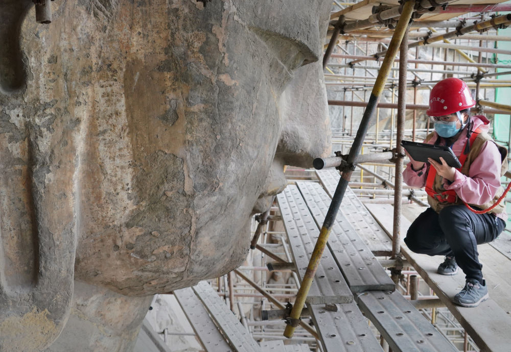 奉先寺位于河南洛陽龍門西山南段,是龍門石窟開鑿規(guī)模最大、最具代表性的摩崖像龕。2022年7月,龍門石窟奉先寺大型滲漏水治理和危巖體加固保護工程完工。這是工作人員在龍門石窟奉先寺進(jìn)行勘測作業(yè)(2022年4月14日攝)。