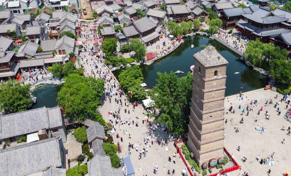 這是位于河南洛陽的洛邑古城景區(qū)(2023年5月2日攝,無人機照片)。洛邑古城里精致的布景、各色表演和漢服妝造拍攝吸引大量游客前來。