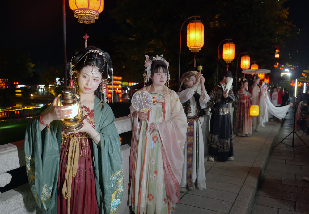 2023年10月24日,游客在洛陽市洛邑古城身著漢服拍照留念。