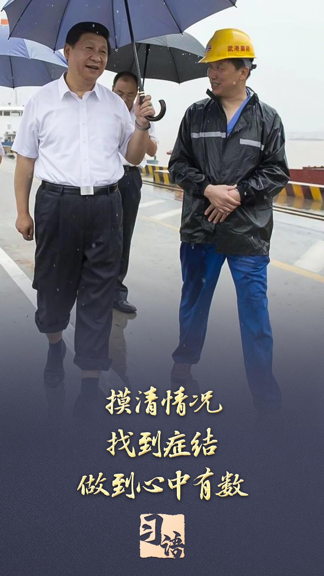 2013年7月,習(xí)近平總書記冒雨來到湖北武漢新港陽邏集裝箱港區(qū)考察,他卷起褲腿,打著雨傘,蹚著積水邊走邊看邊問。兩天后,在武漢主持召開部分省市負(fù)責(zé)人座談會(huì)時(shí),習(xí)近平總書記強(qiáng)調(diào):“研究、思考、確定全面深化改革的思路和重大舉措,刻舟求劍不行,閉門造車不行,異想天開更不行,必須進(jìn)行全面深入的調(diào)查研究?!?/p>
