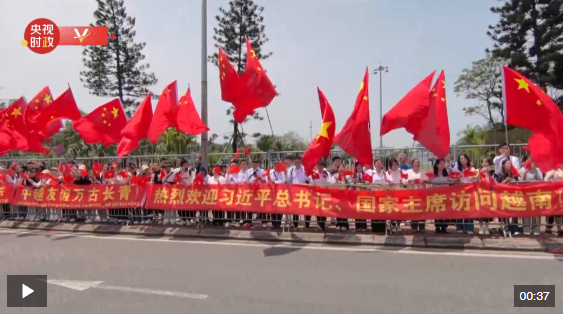 習(xí)近平乘車從機(jī)場(chǎng)赴下榻飯店途中,中越兩黨兩國旗幟迎風(fēng)飄揚(yáng),“中越友誼萬古長青”、“山水相連,命運(yùn)與共”、“中越情誼深,同志加兄弟”等紅色橫幅鮮艷奪目。當(dāng)?shù)孛癖姾椭匈Y機(jī)構(gòu)、留學(xué)生代表聚集在道路兩旁,熱烈歡迎習(xí)近平到訪。