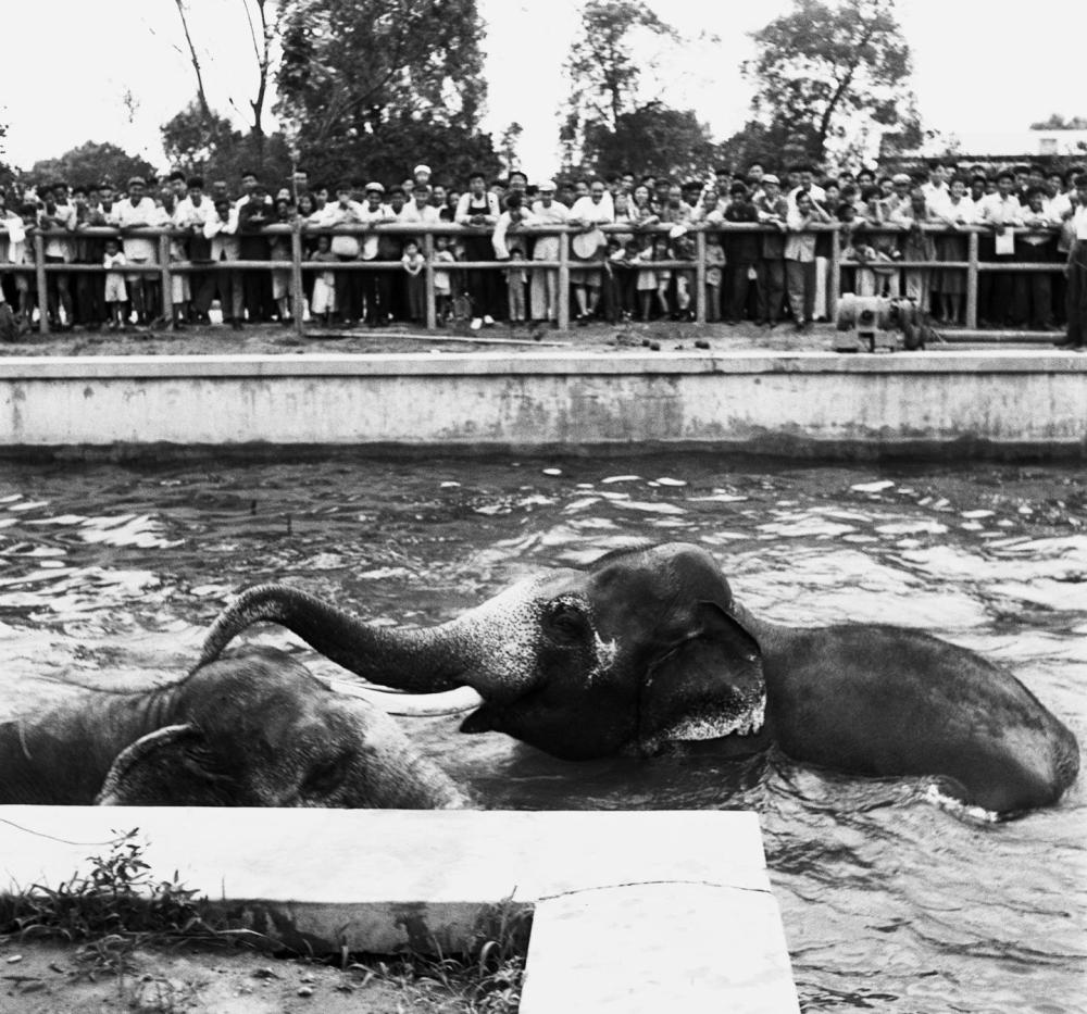1954年7月,觀眾在北京西郊公園動(dòng)物園觀看越南等國家贈(zèng)送的大象。