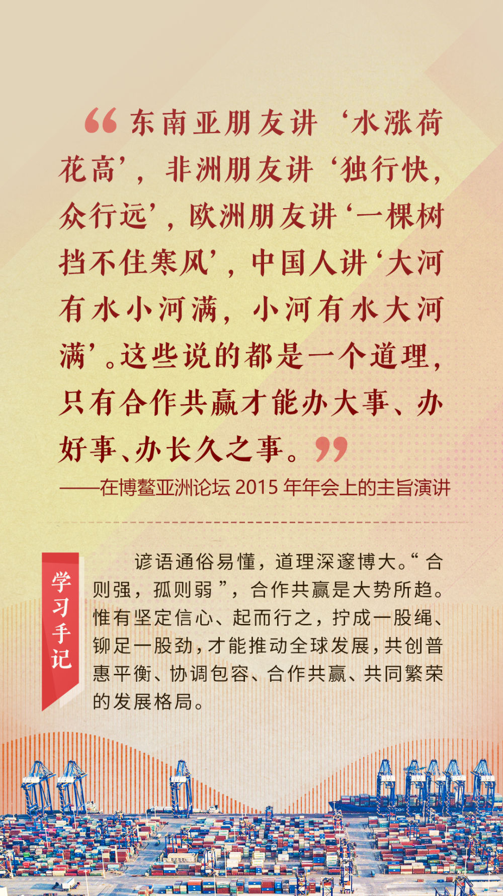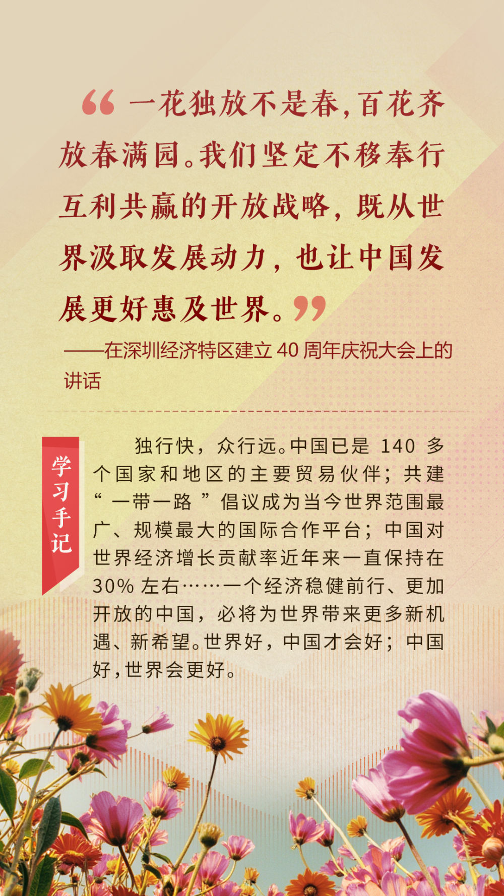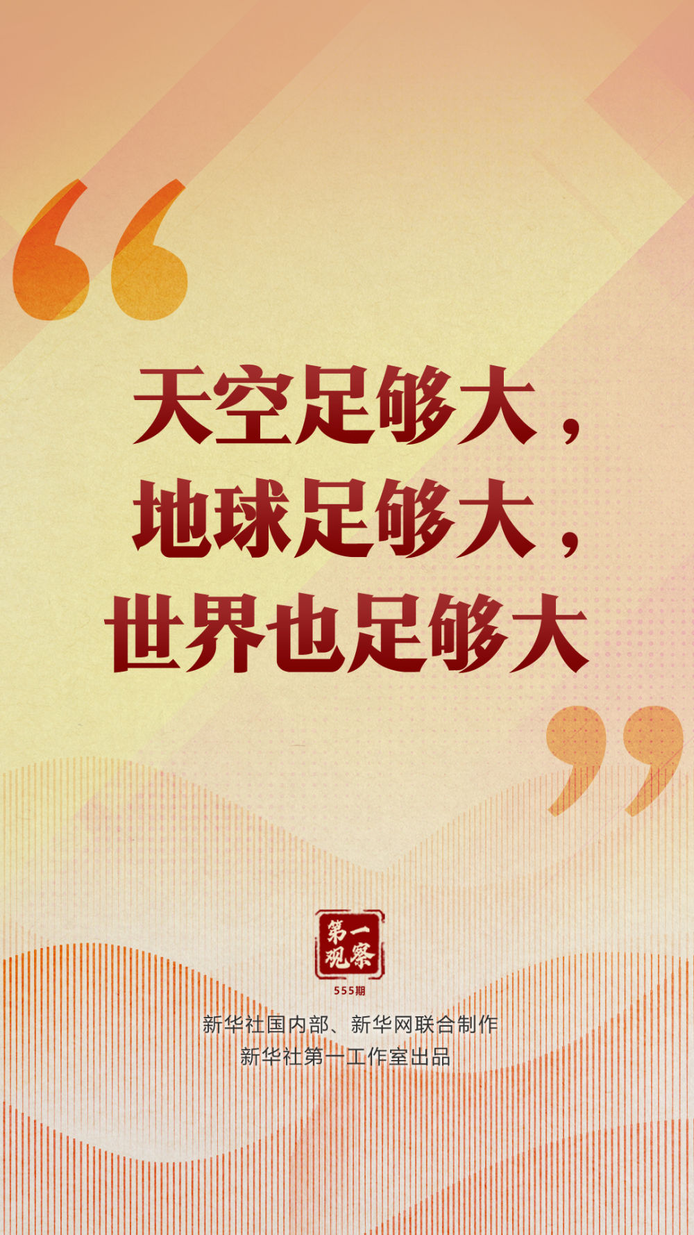 “天空足夠大,地球足夠大,世界也足夠大,容得下各國(guó)共同發(fā)展繁榮”“你中有我、我中有你的命運(yùn)共同體”“與中國(guó)同行就是與機(jī)遇同行”……習(xí)近平總書(shū)記一次次在重要場(chǎng)合發(fā)表重要講話,指引我們站在歷史正確的一邊,站在人類進(jìn)步的一邊,不畏浮云、登高望遠(yuǎn),不懼風(fēng)浪、勇毅前行。