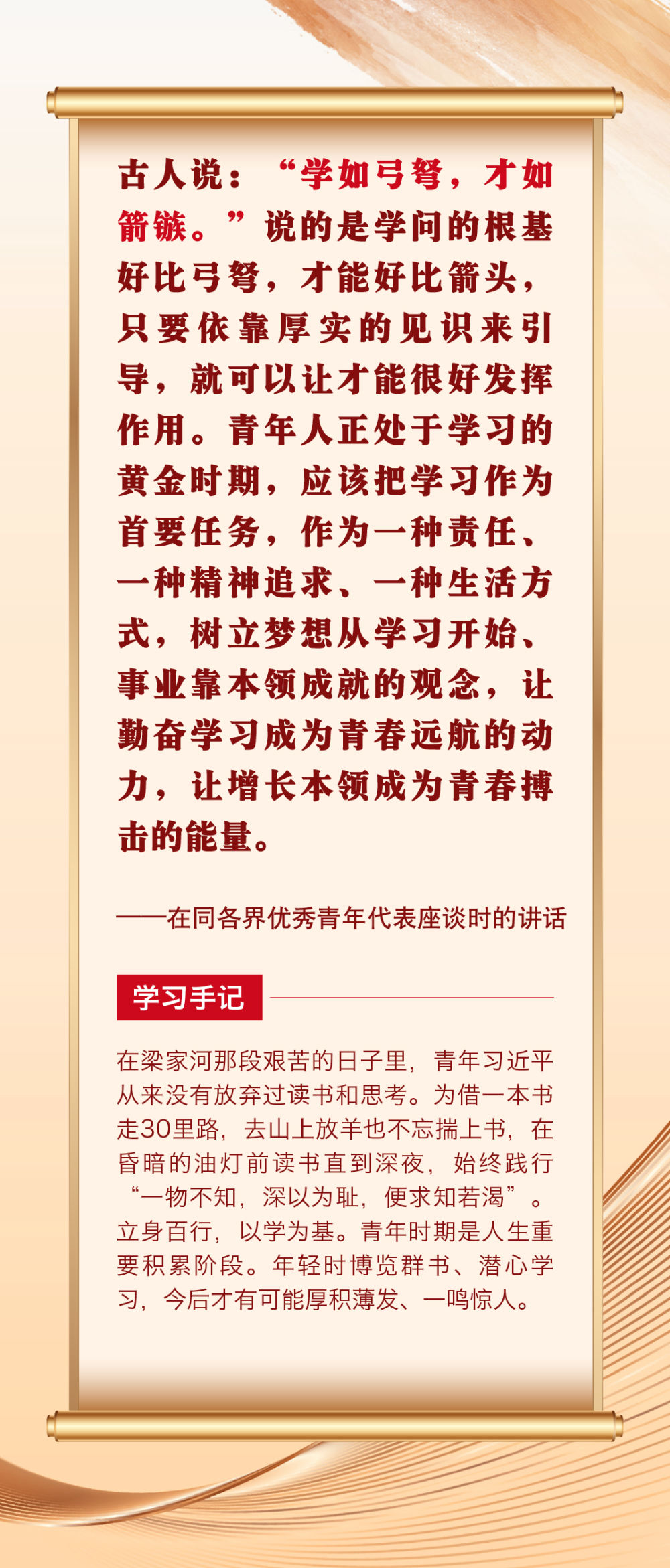 “青年者,國(guó)家之魂?!鼻嗄暌淮院畏N精神風(fēng)貌站上時(shí)代舞臺(tái),關(guān)乎祖國(guó)的明天、民族的未來(lái)。黨的十八大以來(lái),習(xí)近平總書(shū)記圍繞青年成長(zhǎng)成才作出許多重要論述。其中,有信手拈來(lái)的精妙典故,有貫古通今的廣征博引,引領(lǐng)廣大青年不斷在中華文化的浸潤(rùn)中堅(jiān)定中國(guó)心、涵養(yǎng)民族魂,成長(zhǎng)為堪當(dāng)復(fù)興重任的時(shí)代新人。