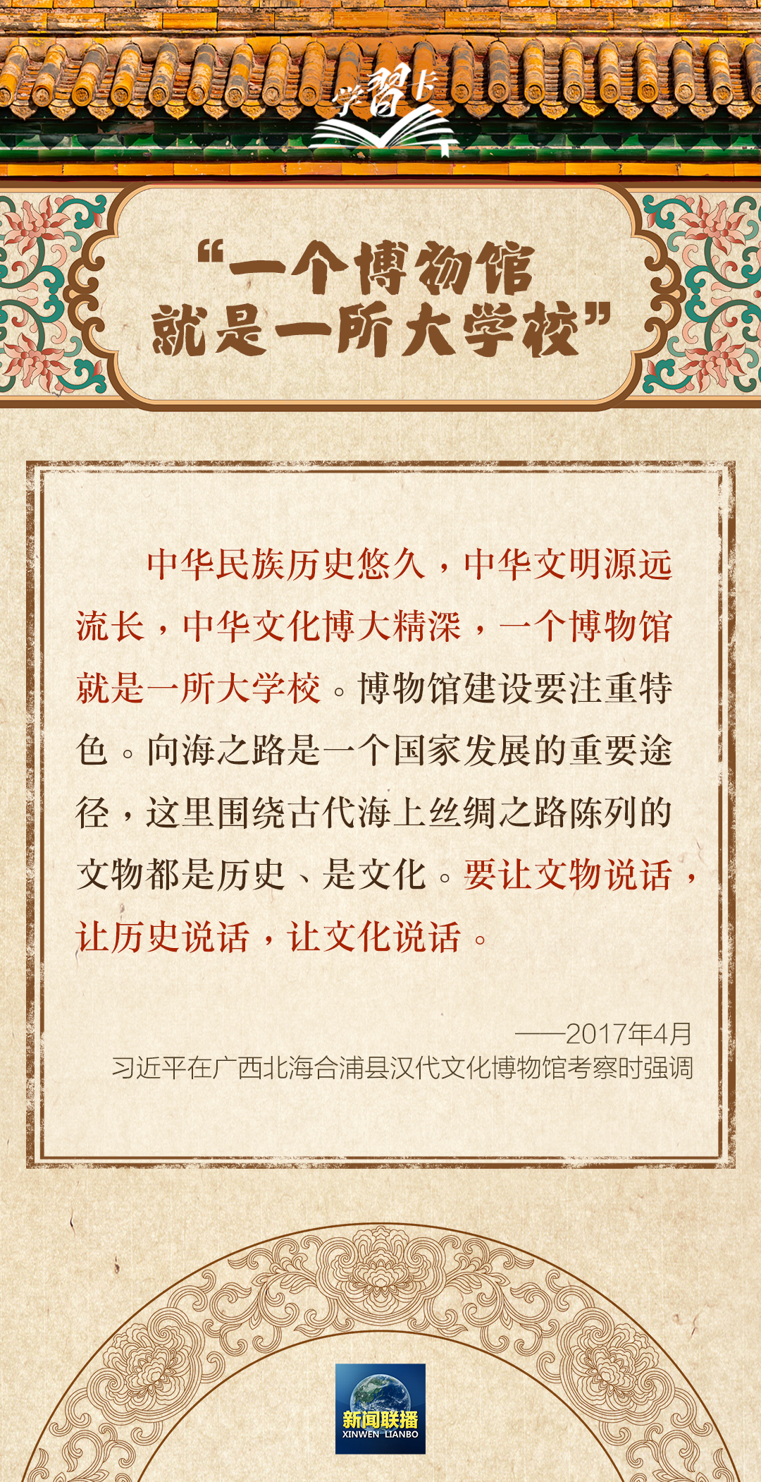 習(xí)近平總書記一直高度重視博物館工作,經(jīng)?!按蚩ā辈┪镳^,察看具有濃郁文化色彩的展品,對(duì)文物保護(hù)和文化傳承工作作出重要部署。