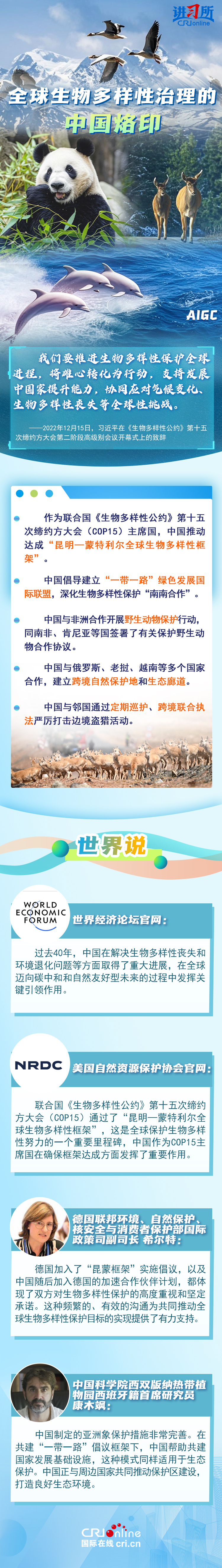 “心往一處想、勁往一處使,共建地球生命共同體?!弊鳛樽钤绾炇稹⑴鷾?zhǔn)《生物多樣性公約》的締約方之一,生物多樣性保護已經(jīng)上升為中國的國家發(fā)展戰(zhàn)略。國際人士表示,中國的一系列舉措體現(xiàn)出對生態(tài)環(huán)境保護的堅定決心,同時,中國依托共建“一帶一路”倡議等國際合作機制,為推動全球生物多樣性保護提供了有力支持,在邁向自然友好型未來的過程中發(fā)揮關(guān)鍵的引領(lǐng)作用。