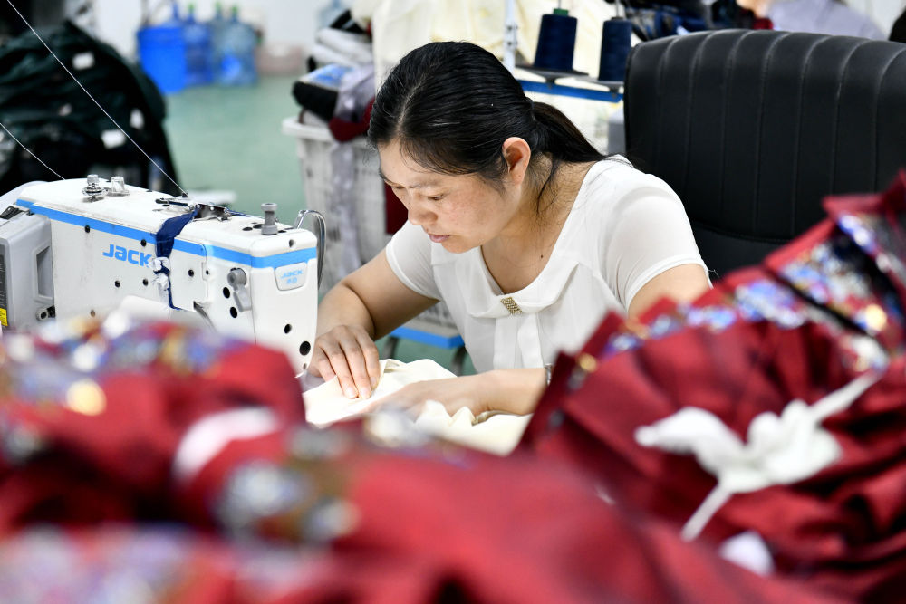 曹縣工作人員在縫制漢服(2023年7月6日攝)。新華社記者郭緒雷 攝