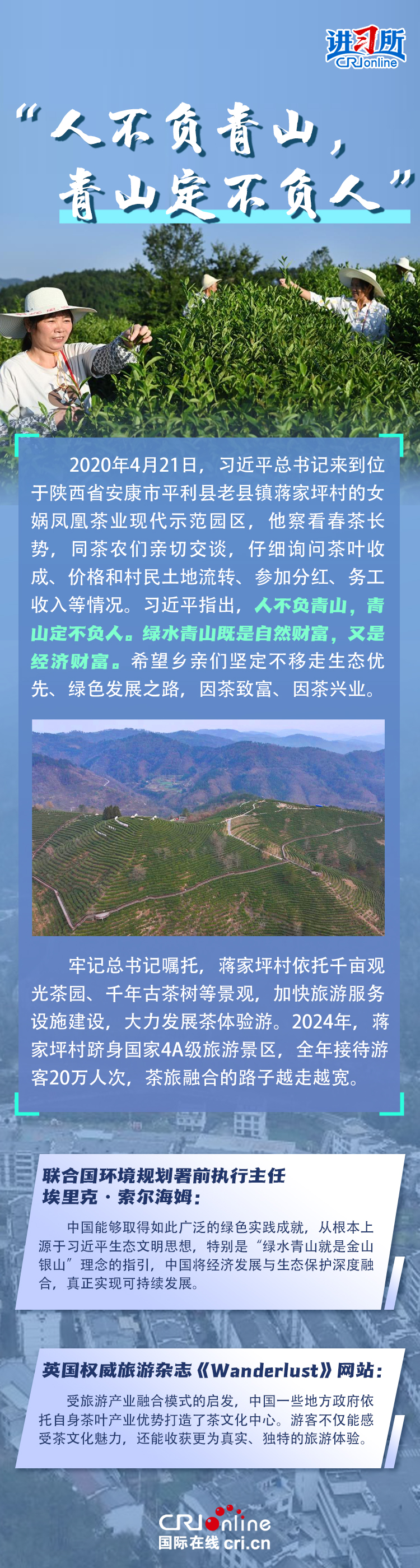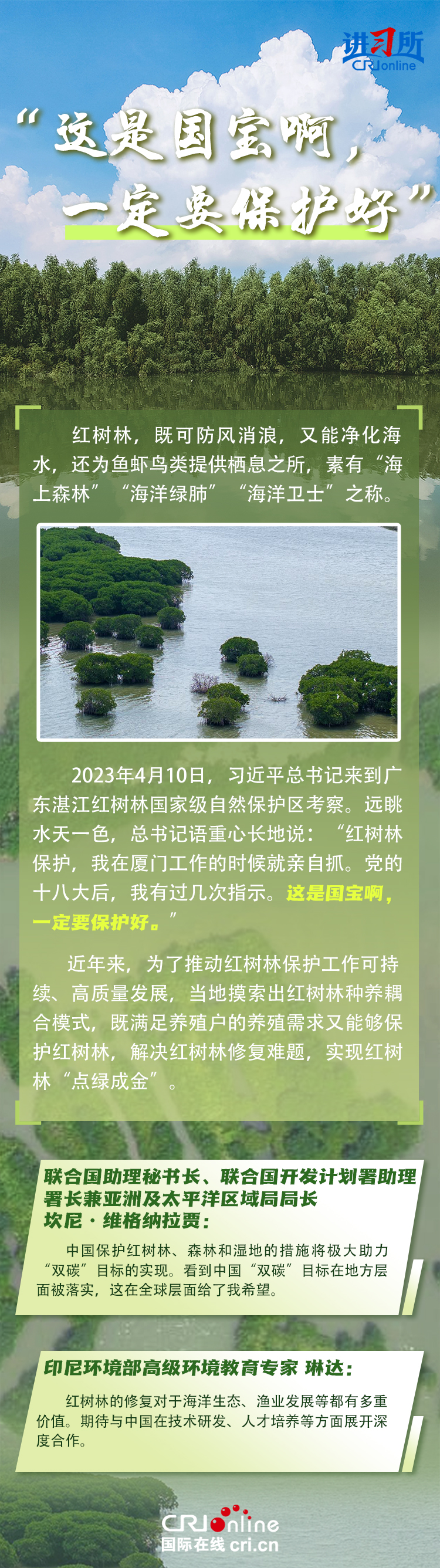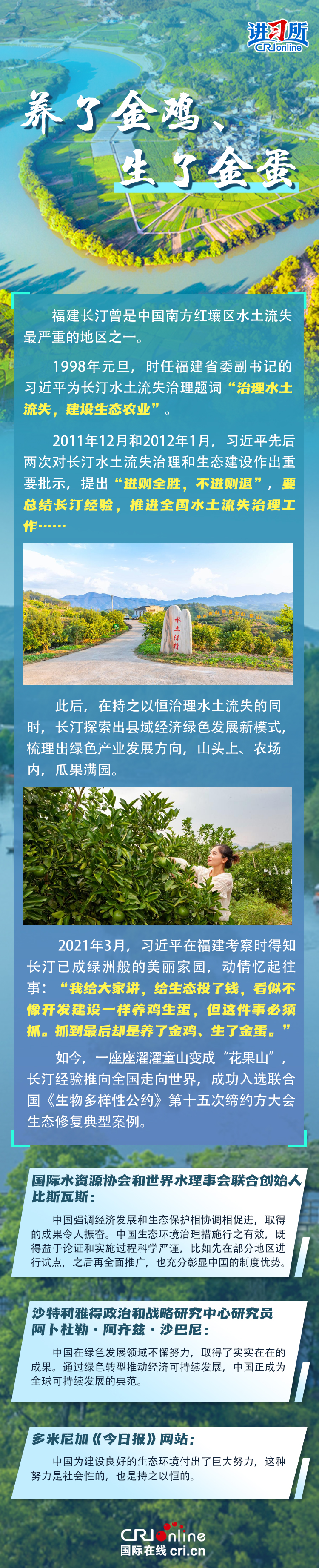 新時代以來,在習(xí)近平生態(tài)文明思想的科學(xué)指引下,“兩山”理念已深入人心,從“點綠成金”的紅樹林到一座座“花果山”,再到走向世界的長汀經(jīng)驗……美麗中國建設(shè)邁出重大步伐,生態(tài)環(huán)境保護(hù)發(fā)生歷史性變化。國際社會認(rèn)為,中國取得廣泛的綠色發(fā)展成就,從根本上源于習(xí)近平生態(tài)文明思想,特別是“兩山”理念的指引。在通過綠色轉(zhuǎn)型推動經(jīng)濟(jì)可持續(xù)發(fā)展方面,中國正成為全球可持續(xù)發(fā)展的典范。