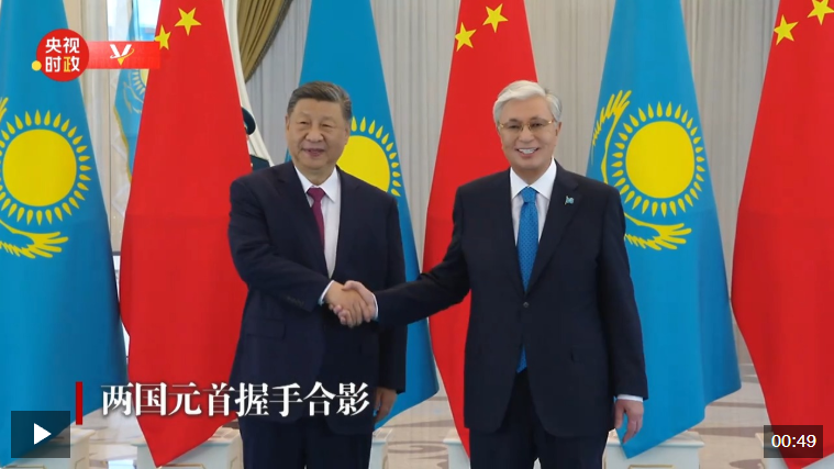 當(dāng)?shù)貢r(shí)間6月16日下午,國家主席習(xí)近平乘車抵達(dá)阿斯塔納總統(tǒng)府,托卡耶夫總統(tǒng)在下車處迎接。會(huì)談前,兩國元首握手合影。