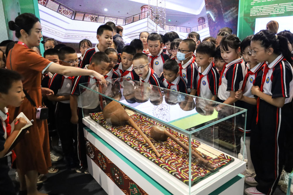2023年9月7日,在甘肅敦煌舉行的第六屆絲綢之路(敦煌)國際文化博覽會上,學(xué)生們參觀土庫曼斯坦專題展。