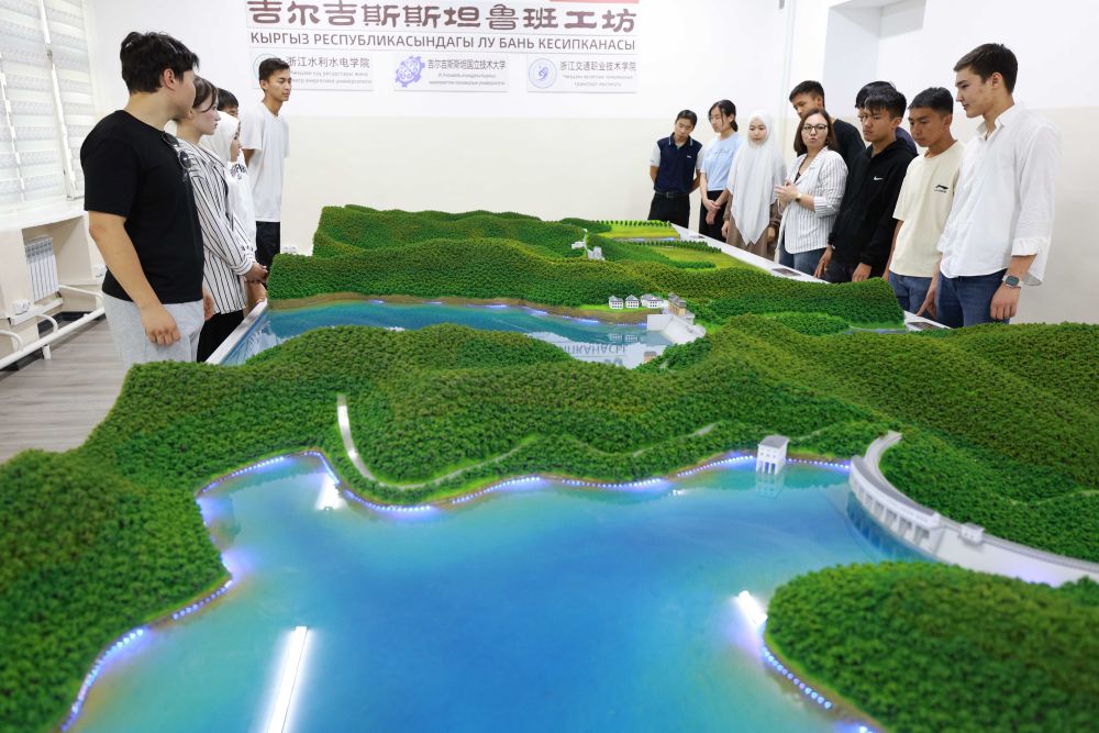 2025年6月4日,學(xué)生在吉爾吉斯斯坦首都比什凱克的魯班工坊水利樞紐工程模擬演示實(shí)驗(yàn)室學(xué)習(xí)水電站知識。這家魯班工坊由浙江水利水電學(xué)院與吉爾吉斯斯坦國立技術(shù)大學(xué)等聯(lián)合建設(shè),投入運(yùn)行半年多來,已有4000多名學(xué)生在這里接受技術(shù)培訓(xùn)。