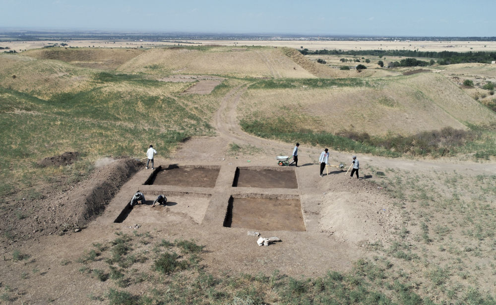 2023年8月9日,考古人員在中哈聯(lián)合考古項(xiàng)目拉哈特遺址探方上工作(無人機(jī)照片)。從2017年開始,陜西省考古研究院與哈薩克斯坦伊塞克國家歷史文化博物館組成聯(lián)合考古隊(duì),對拉哈特遺址及附近相關(guān)遺址開展考古調(diào)查與發(fā)掘工作。
