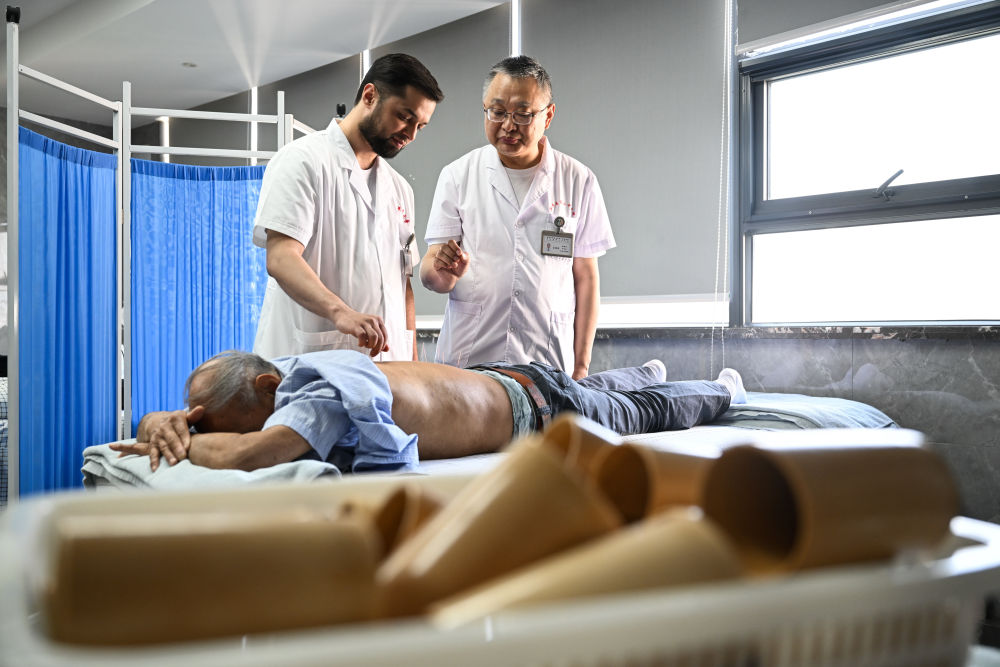 2025年4月18日,在南京中醫(yī)藥大學(xué)第二附屬醫(yī)院針灸康復(fù)科,李小龍(后左)在導(dǎo)師張建斌指導(dǎo)下給患者行針。南京中醫(yī)藥大學(xué)2023級針灸推拿專業(yè)的碩士研究生阿米爾中來自塔吉克斯坦首都杜尚別。中學(xué)時,他愛上了中國文化,給自己取了個中文名字“李小龍”。他刻苦學(xué)習(xí)中文,參加漢語橋中學(xué)生中文比賽,后來多次來到中國,與中醫(yī)結(jié)緣。2015年,李小龍到北京中醫(yī)藥大學(xué)學(xué)習(xí)針灸推拿,畢業(yè)后回到杜尚別開了自己的中醫(yī)診所。2023年,為了進(jìn)一步提升自己,李小龍來到南京中醫(yī)藥大學(xué)攻讀碩士研究生?!敖窈螅蚁M阎嗅t(yī)帶到更多的國家,讓更多人感受中醫(yī)的妙處?!?/p>