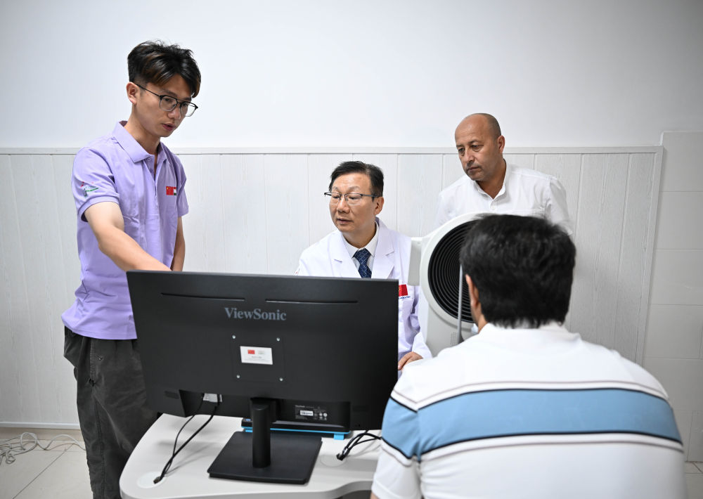 2025年5月31日,在塔吉克斯坦杜尚別,中國眼科專家黨光福(中)在防盲合作中心為當(dāng)?shù)厥忻褡鲅劭茩z查。當(dāng)日,“健康快車中塔防盲合作中心”在塔吉克斯坦首都杜尚別開始運(yùn)營。該中心旨在加強(qiáng)中塔兩國眼科醫(yī)療合作,促進(jìn)雙方眼科醫(yī)護(hù)人員互訪培訓(xùn)和學(xué)術(shù)交流,將惠及更多眼疾患者。