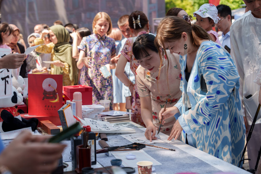 2025年4月19日,在哈薩克斯坦阿拉木圖,一名中國文化愛好者在“國際中文日”慶祝活動上體驗(yàn)書法。
