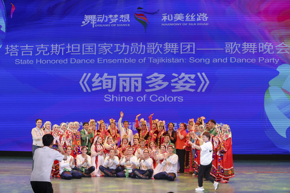 2023年7月27日,由塔吉克斯坦羅拉國家功勛歌舞團(tuán)帶來的歌舞晚會《絢麗多姿》在新疆烏魯木齊晚報(bào)劇院上演。這是演員在演出結(jié)束后合影留念。