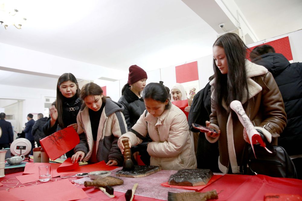 2023年12月26日,人們在吉爾吉斯斯坦比什凱克舉行的“一帶一路”暨中原文化交流展上體驗(yàn)中國文化。本次展覽主要展出了以“拓傳春秋”為主題的石刻藝術(shù)及以“年畫”為主題的木刻和剪紙藝術(shù)作品。