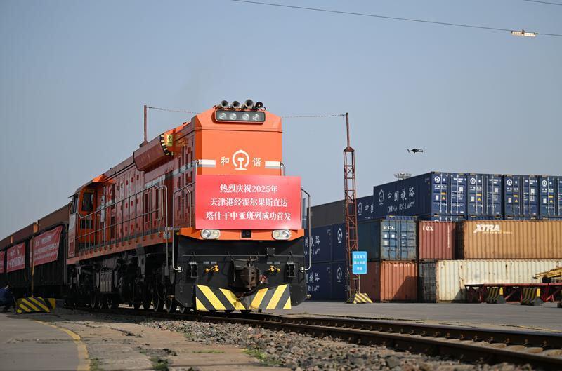 △5月20日,2025年首列天津港經(jīng)霍爾果斯直達(dá)塔什干的中亞班列從天津港物捷三堆場(chǎng)發(fā)車(chē)。