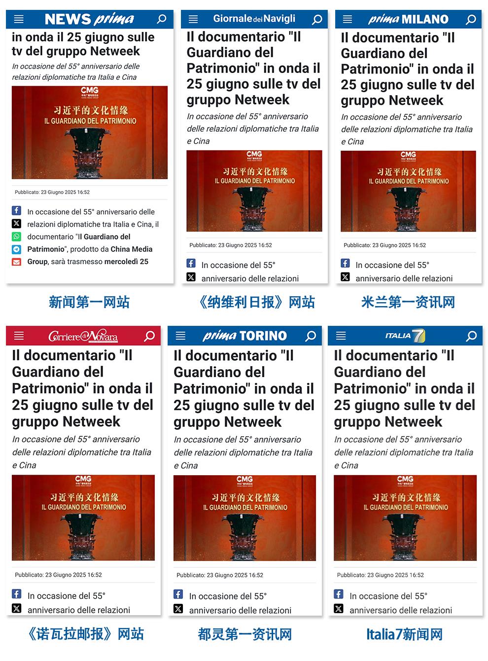 意大利新聞第一網站、《納維利日報》網站、米蘭第一資訊網等40多家主流媒體發(fā)布節(jié)目播出消息。文章指出,節(jié)目通過生動的故事展示出習近平主席治國理政理念的深厚文化根基,讓海外受眾了解中國在文化傳承發(fā)展上所做出的不懈努力。
