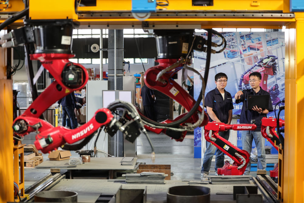 2024年6月3日,沈陽新松機(jī)器人自動(dòng)化股份有限公司的機(jī)器人研發(fā)工程師討論智能焊接機(jī)器人平臺(tái)焊接方案。機(jī)器人工程技術(shù)人員作為人力資源和社會(huì)保障部2022年6月公布的18個(gè)新職業(yè)之一,在研發(fā)設(shè)計(jì)機(jī)器人工作中扮演著重要角色。讓“鐵疙瘩”聽懂話、干對(duì)活,是他們的重要工作內(nèi)容。