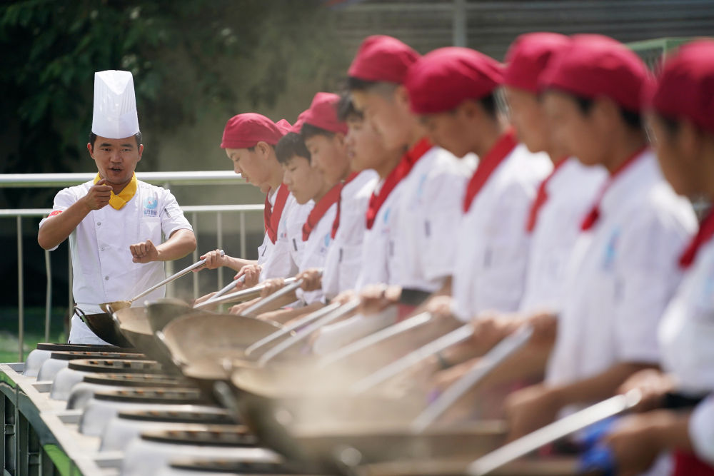 2023年6月25日,在位于西安市藍(lán)田縣的藍(lán)田廚師學(xué)校,教師指導(dǎo)學(xué)生們練習(xí)翻勺。藍(lán)田縣是著名的“廚師之鄉(xiāng)”。通過成立廚師學(xué)校,培養(yǎng)具有較高文化素養(yǎng)、藝術(shù)素養(yǎng)的一專多能的新一代廚師,藍(lán)田縣讓具有地方特色的職業(yè)教育拓展就業(yè)渠道,助力鄉(xiāng)村振興。