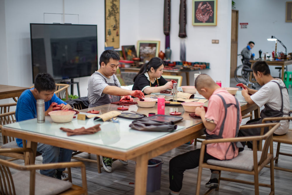 2023年9月18日,在重慶市城口縣的“忘我”大漆藝術(shù)空間,殘障員工打磨漆器產(chǎn)品?!巴摇贝笃崴囆g(shù)空間集殘疾人漆藝培訓(xùn)、輔助性就業(yè)、職業(yè)康復(fù)、日間照料等功能于一體,利用當(dāng)?shù)氐拇竽酒豳Y源,組織殘疾人創(chuàng)作漆器產(chǎn)品。